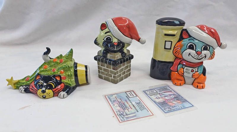 Three christmas themed lorna bailey porcelain cats including christmas mayhem, seasons greetings the cat and 1 other - tallest 13.5 cm