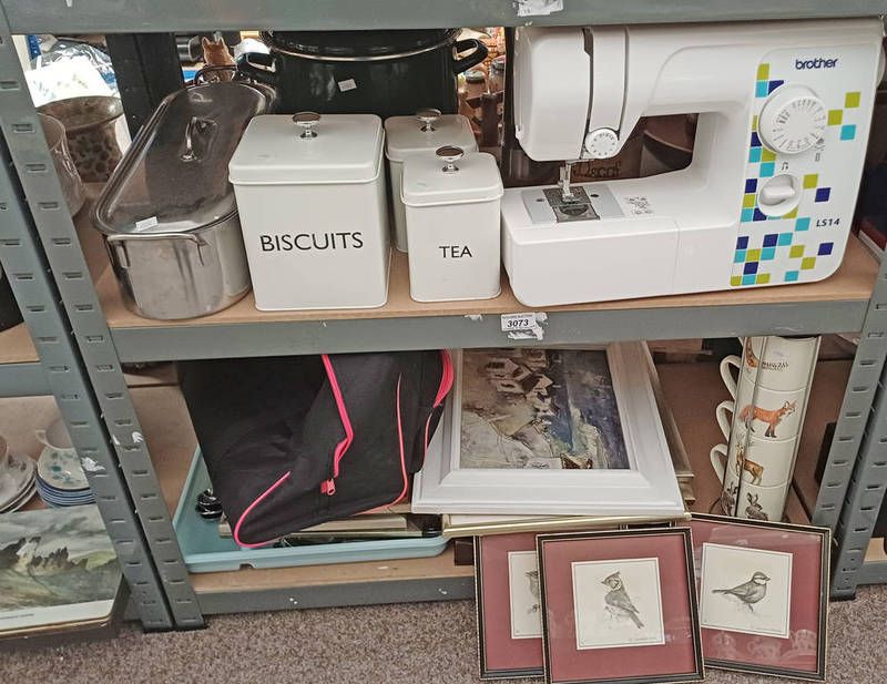 Brother ls14 sewing machine together with various framed pictures, fish kettle and others over 2 shelves