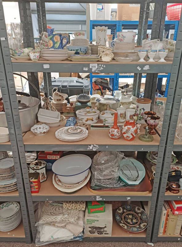 Selection of various porcelain, etc including kutani vases, mantle clock, barometer, dinnerware and others over 4 shelves