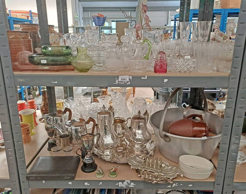 Selection of various crystal, glass, silver plate etc including tea pots, trophies, champagne flutes and others over 2 shelves