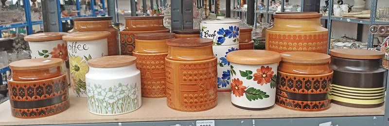 Quantity of hornsea porcelain storage jars with heirloom, saffron, fleur patterns etc over 1 shelf