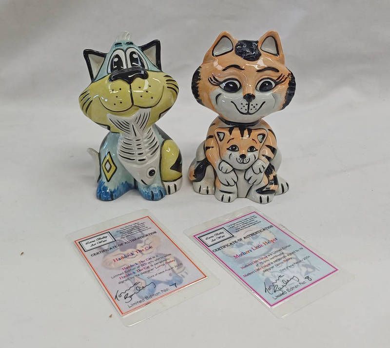 Two lorna bailey porcelain cats: haddock the cat & mothers little helper. both with certificates - tallest 13 cm