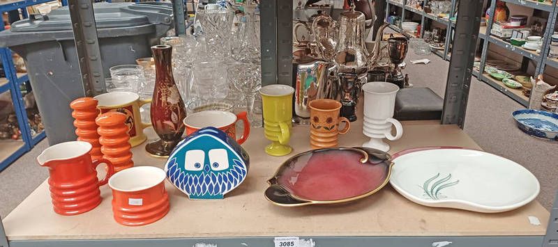 Various items of carlton ware porcelain including owl money bank, george & the dragon mug, salt & pepper shakers and others over 1 shelf