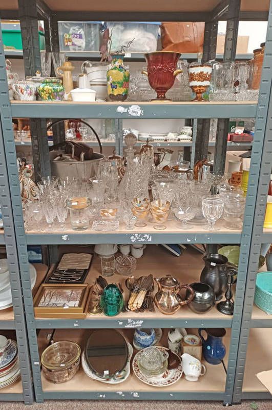 Large selection of cut glass, large green glass paperweight, cloisonne vase, cased cutlery, etc on 4 shelves