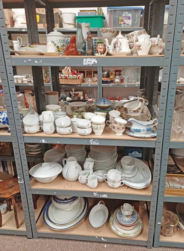 Excellent selection of porcelain dinnerware, teaware porcelain figures, etc on 4 shelves