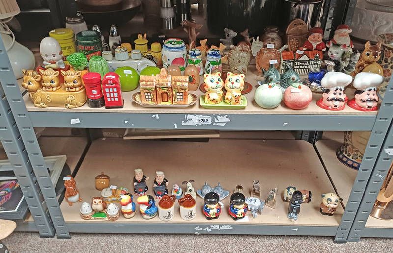 Excellent selection of cruet sets including fish, cats, etc on 2 shelves