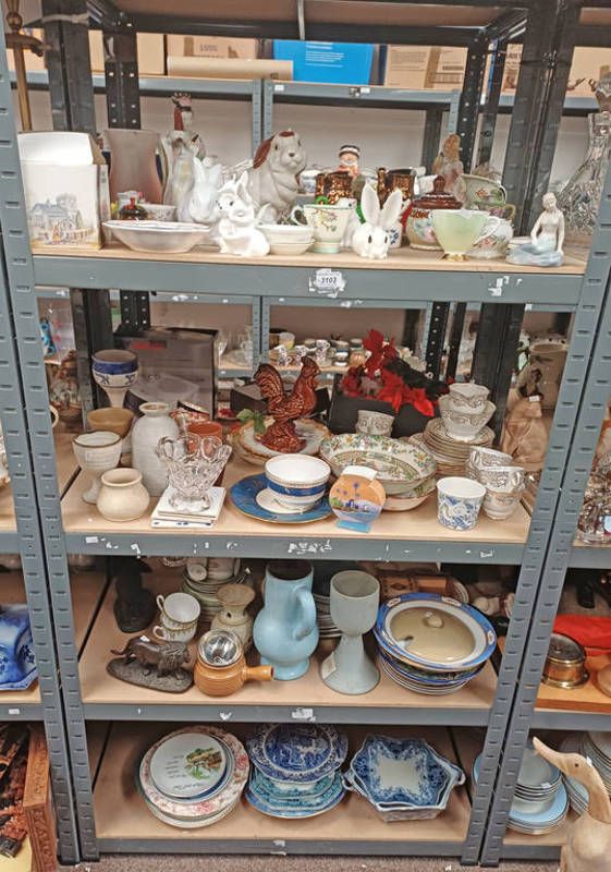 Royal osborne porcelain rabbits, various other pottery porcelain, royal doulton teaset, etc on 4 shelves