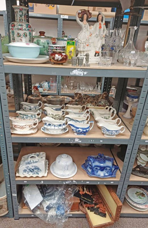 19th century staffordshire figure group, various oriental bowls, vases, etc, 14 19th & 20th century sauce boats, cheese dishes, chess set in carved box, etc on 4 shelves