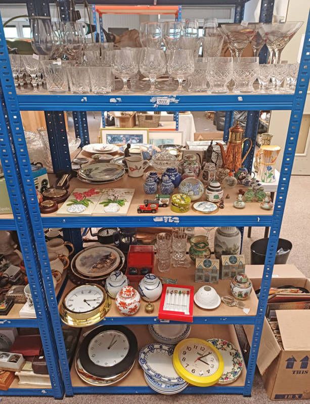 Excellent selection of crystal & cut glass selection of oriental ware including scent bottles, vases, ginger jars, various other porcelain, brass wall clock, etc over 4 shelves