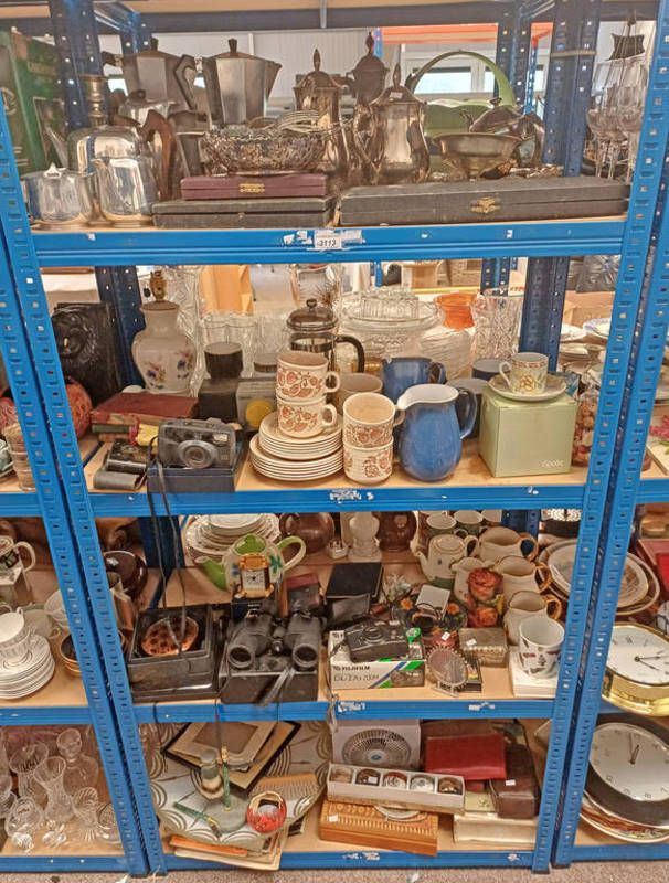 Pentax camera, fuji film camera, pair of bak 4 prisms, binoculars, seiko clock, various glass & porcelain ware churchill teaset, large selection of silver plated ware, cased horn handled carving set, 4 piece picquot ware teaset, etc over 4 shelves