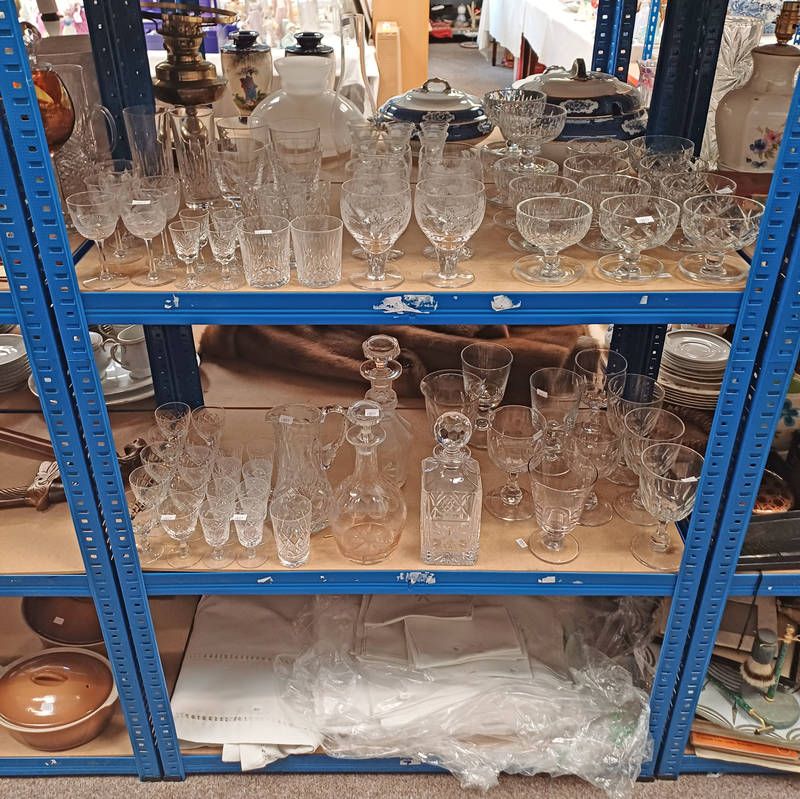 Selection of various crystal & glass including decanters, wine glasses, sherry glasses and linen over three shelves