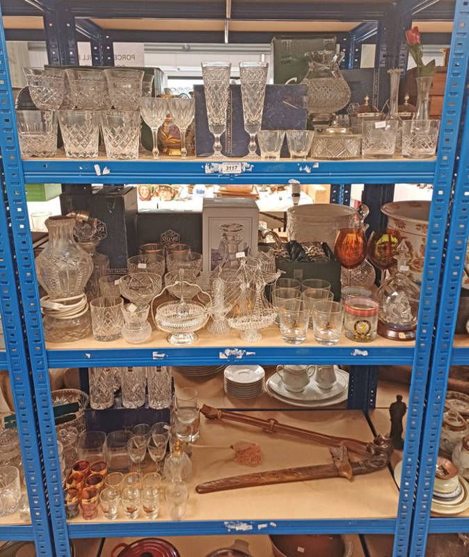 Selection of various crystal including decanter, whisky glasses, hi ball tumblers and others over 3 shelves