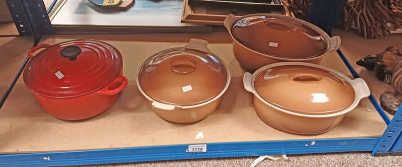 Four le creuset lidded pots over 1 shelf