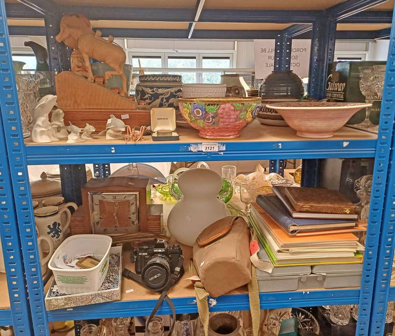 Selection of various items including oak cased mantle clock, minolta x-300 35mm slr camera, maling bowl and others over 2 shelves