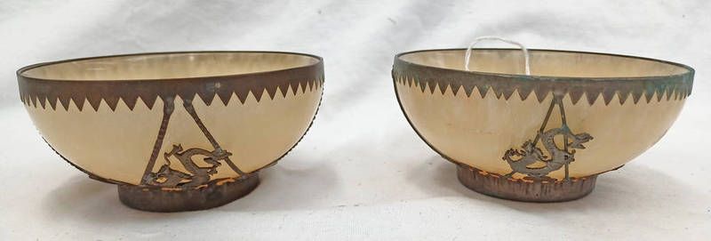 Pair of chinese soap stone dishes with metal mounts, dragon decoration and character mark to base. diameter - 11 cm
