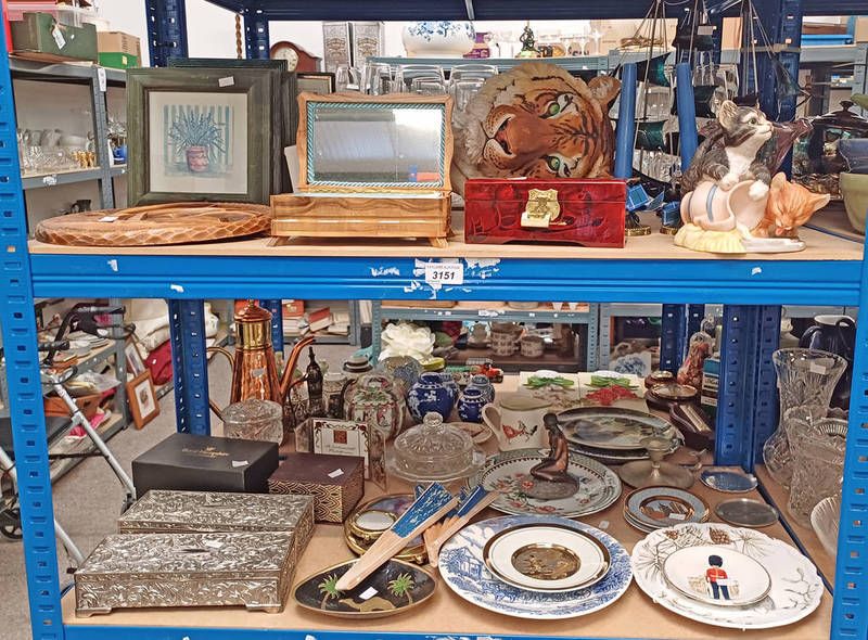 Selection of various porcelain jewellery boxes, pictures etc on 2 shelves