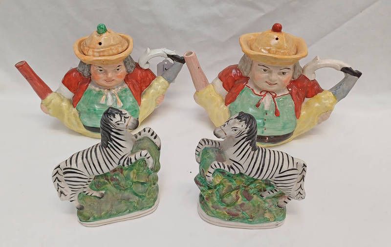 Pair staffordshire pottery toby peg leg tea pots & a pair staffordshire pottery zebras - tallest 20 cm