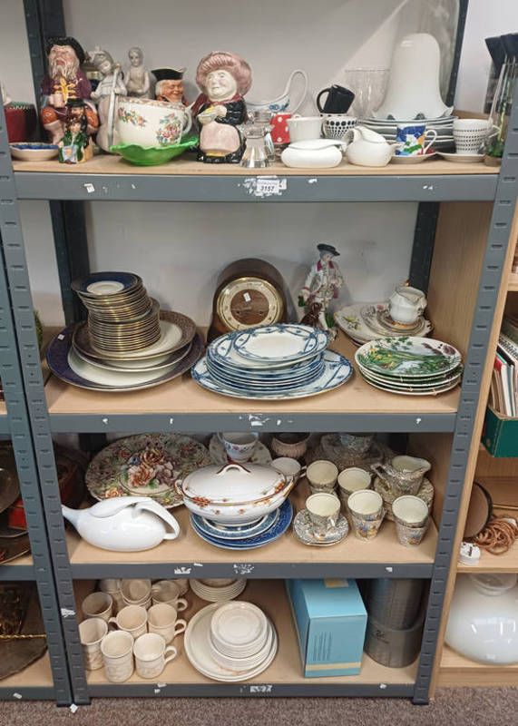 Large selection of porcelain etc including dinnerware, mantle clock, figures etc on 4 shelves
