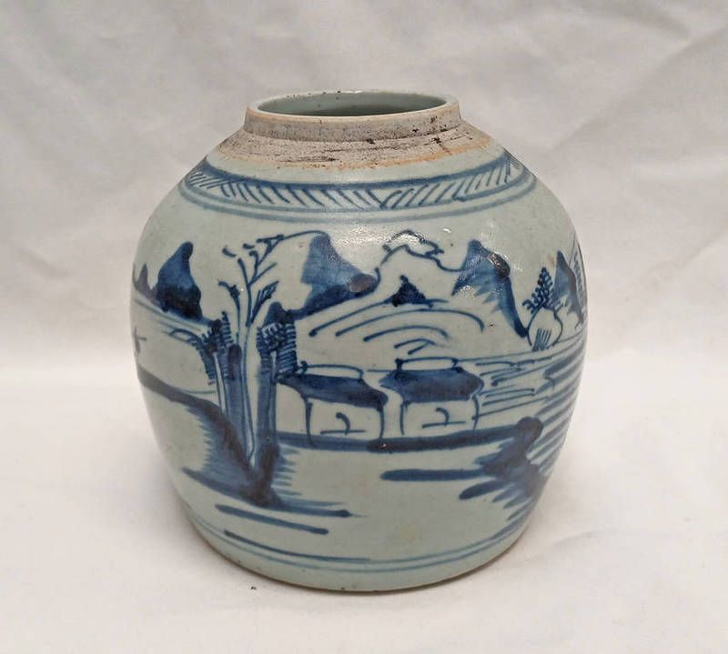 19th century chinese blue & white jar with rural scene decoration - 16 cm tall