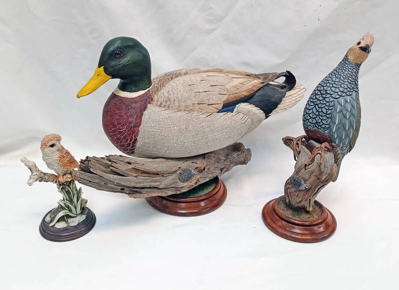 Wooden mallard duck marked harp on circular stand - 29 cm tall etc
