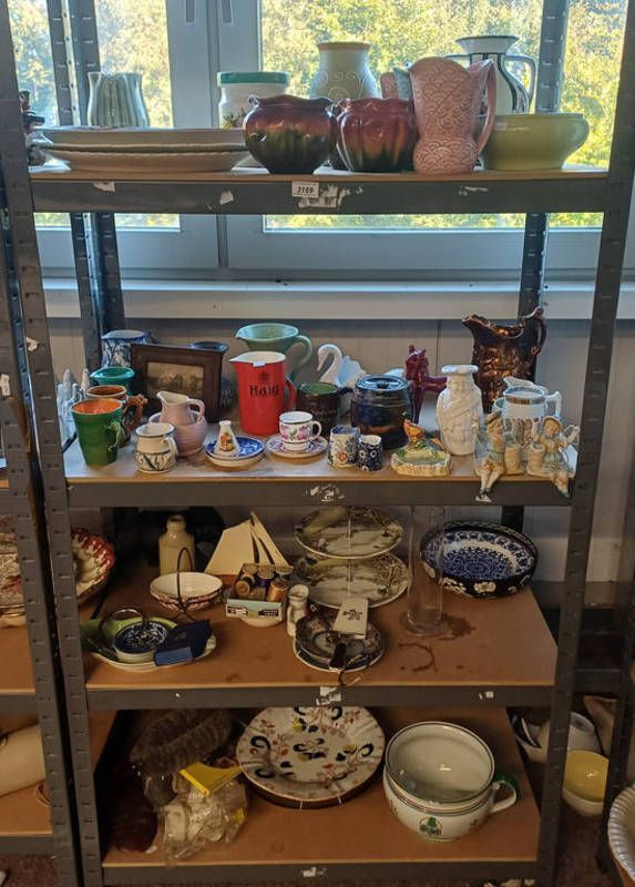 Selection of various porcelain, art pottery, etc including haig whisky water jug, cake stand, vases lustre jug, etc over 4 shelves