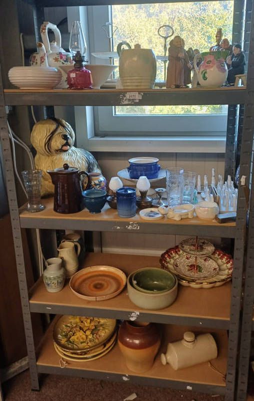 Selection of various porcelain, etc including cranberry glass, paraffin lamp, stoneware jar, decorative monk figures and others over 4 shelves