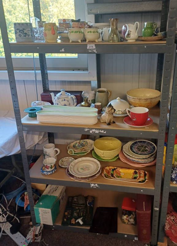 Selection of various porcelain, etc including tea pots, bowls, jugs, sylvac flower holders, etc over 4 shelves