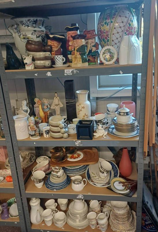 Selection of various porcelain, pottery, etc including toby jugs, porcelain figures, vases & others over 4 shelves