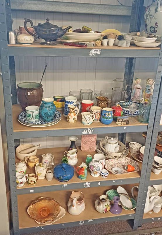 Selection of various porcelain, glass, etc including stoneware jar, jugs, vases, bowls & others over 4 shelves