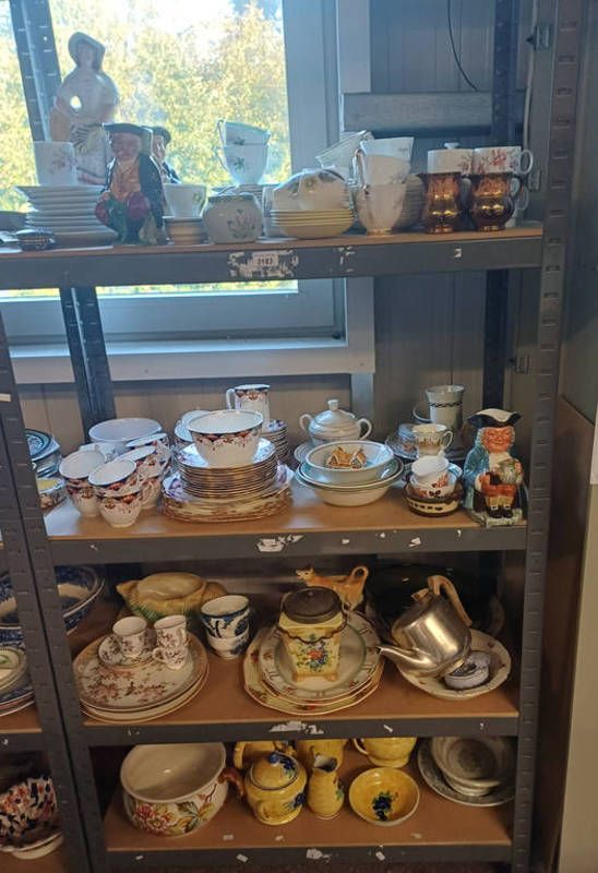Selection of various porcelain, etc including toby jugs, tea sets, biscuit barrels & others over 4 shelves