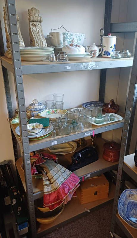 Selection of various porcelain, glass, etc including plaster corbels, brass candlesticks, doll & others over 4 shelves
