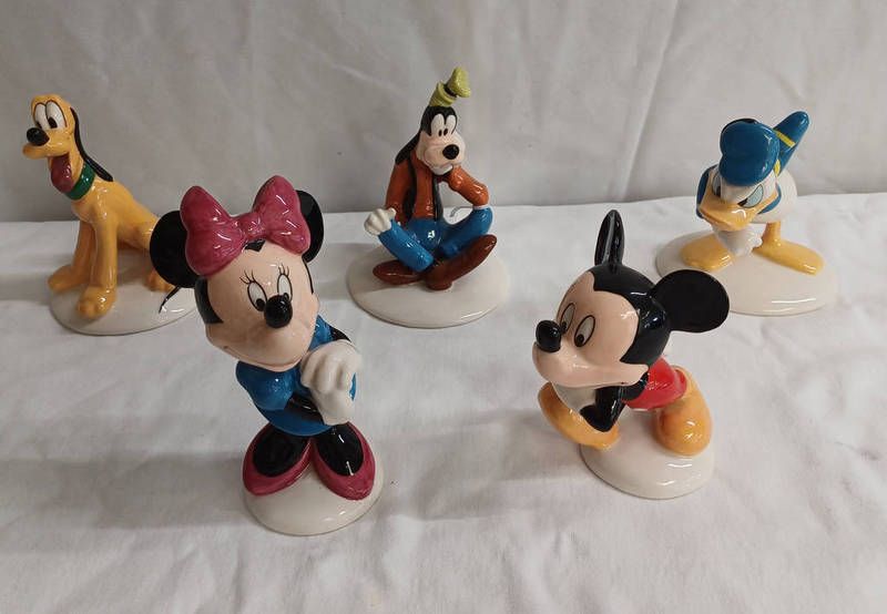 Five royal doulton disney character porcelain figures including mm1 - mickey mouse, mm2 - minnie mouse, mm3 - donald duck, mm5 - goof and mm6 -pluto - tallest 15 cm