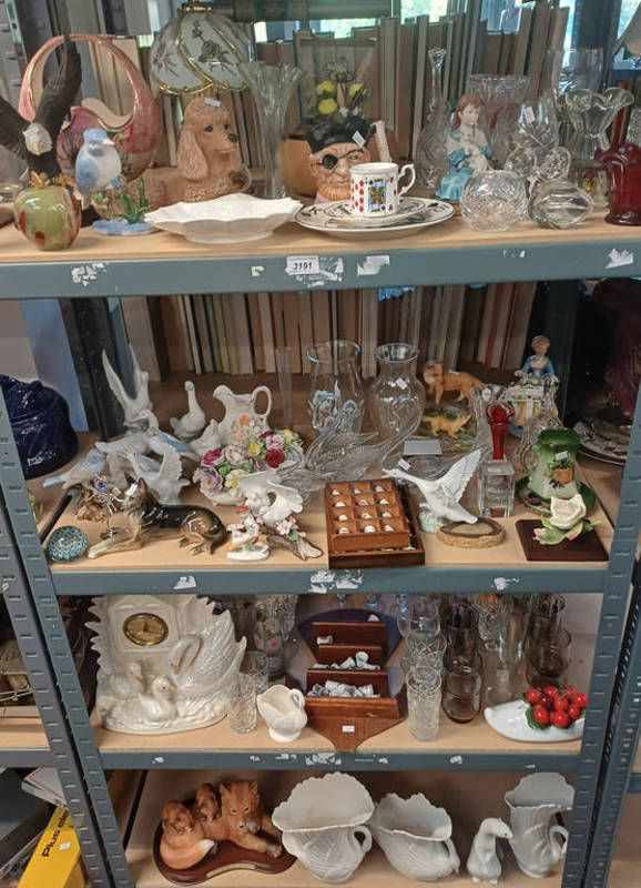 Selection of various porcelain, glass, etc including maling basket, decorative figures, vases, paperweights & others over 4 shelves