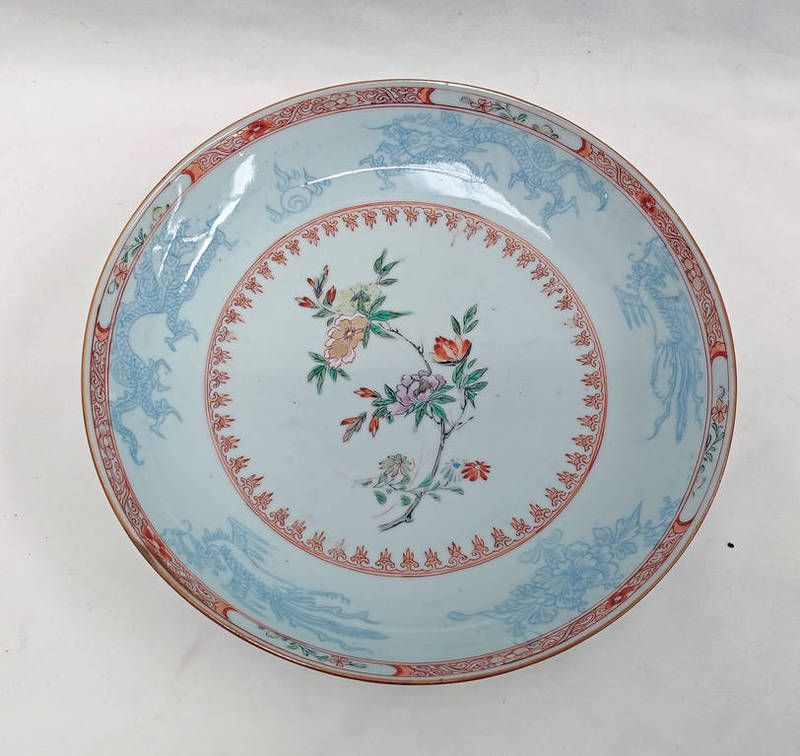 18th century chinese porcelain shallow dish decorated with a floral spray to centre & a pair of pale blue dragons & phoenix to border, possibly kangxi period, unmarked - 22 cm diameter