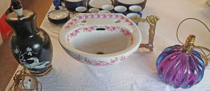 Armitage shanks porcelain sink with floral decoration - width - 40 cm together with two table lamps and brass art nouveau style photo frame