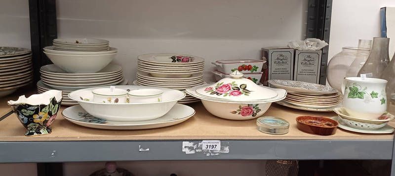 Selection of various porcelain dinnerware, napkin rings, paperweight, etc over 1 shelf
