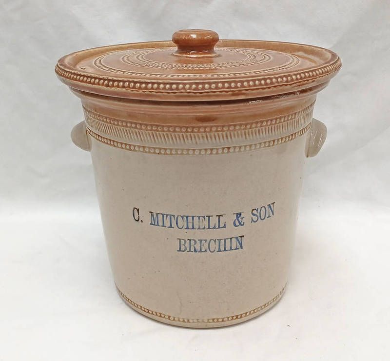 A.w buchan & co portobello 10 lb stoneware lidded pot marked c. mitchell & son, brechin