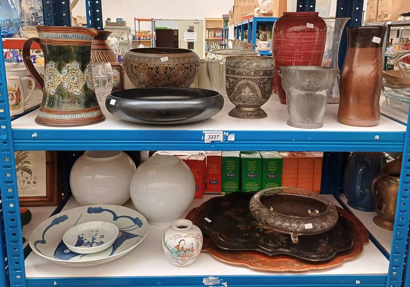 Selection of various porcelain, metal ware, etc including doulton lambeth jug, chinese fish decorated plate, brass bowl, art nouveau pewter vase, etc over 2 shelves