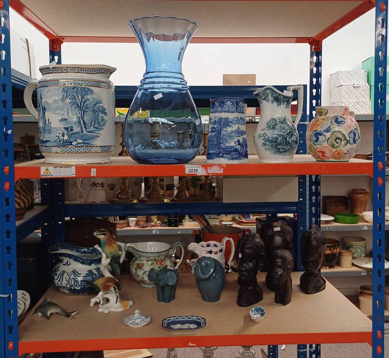 Selection of various items including blue & white porcelain jugs, hardwood african busts, decorative figures & others over 2 shelves