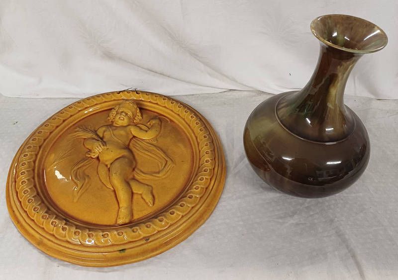 Dunmore pottery mustard glazed oval plaque decorated with a cherub 31cm wide impressed mark & mottled green vase with impressed mark 20cm tall