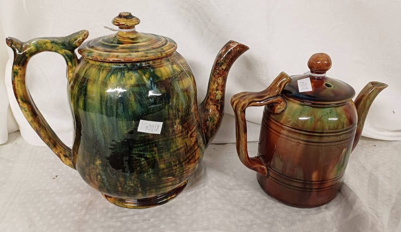 2 dunmore pottery teapots in mottled green & brown both impressed marks to side, tallest 18cm