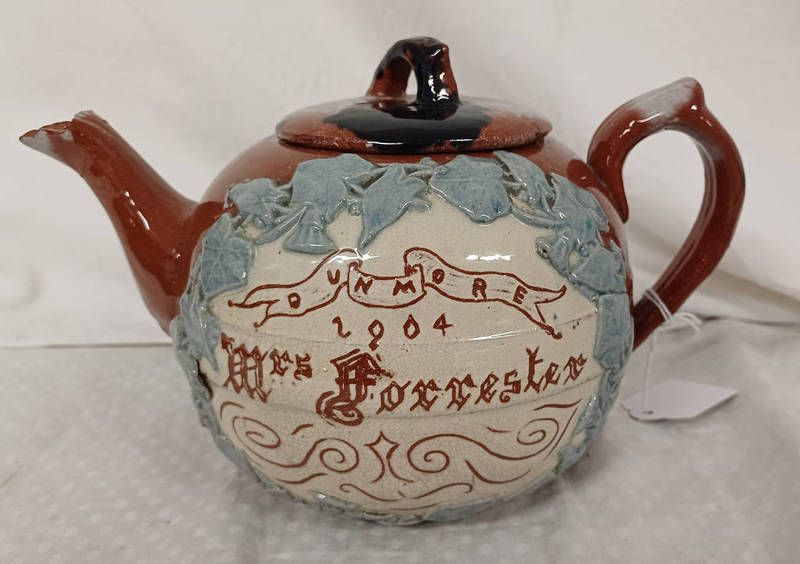 Early 20th century scottish pottery teapot decorated with blue ivy & marked dunmore, mrs forrester to side provenance lot 1352 fingask castle christies april 1993, 14cm tall