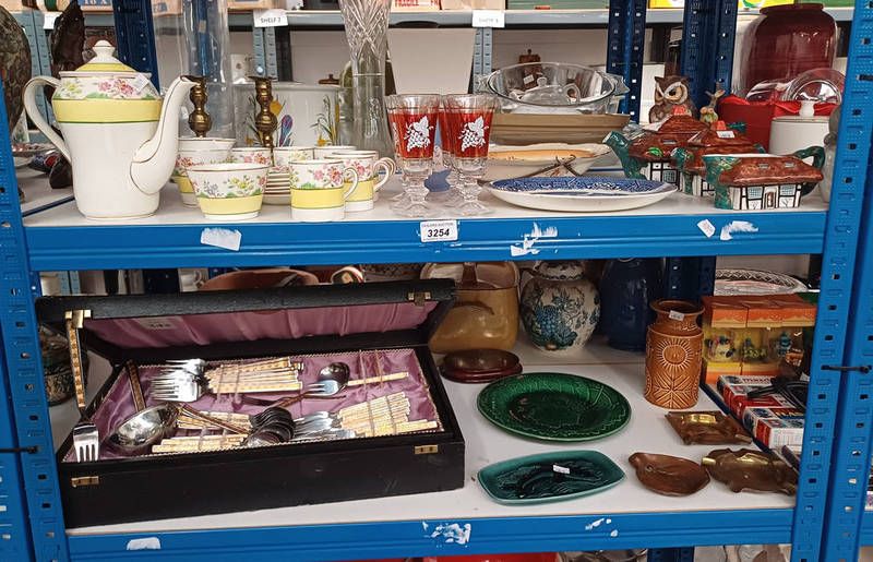 Selection of various porcelain, glass, etc including cased cutlery, poole pottery dish, teaset with floral decoration & others over 2 shelves