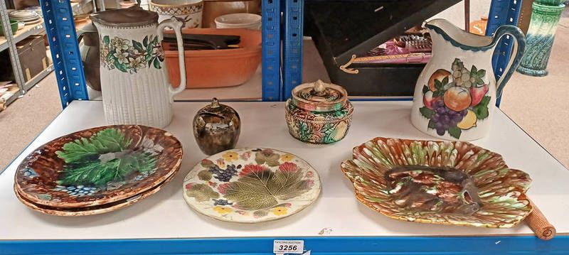 Selection of scottish pottery including seaton money bank, lanark, britannia pottery jug with fruit decoration, alloa pottery plate with grape decoration & others over 1 shelf