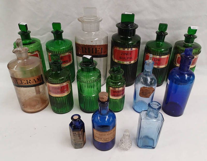 Selection of various green, blue & clear chemist jars marked hydrarg perchlor, tinct strophan, lin aconiti & others