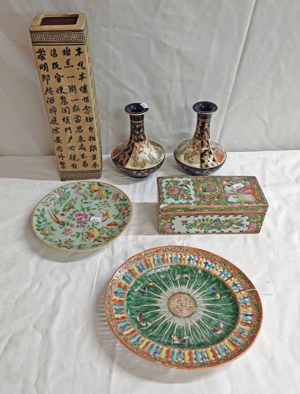 Selection of various chinese porcelain & pair of satsuma vases (height 16cm) together with canton famille rose lidded box, plate etc