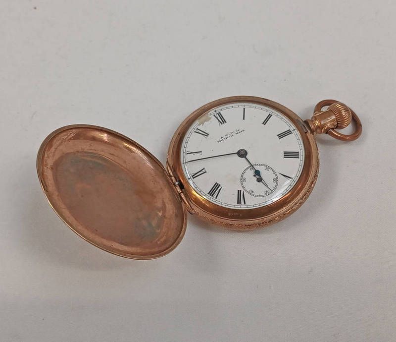 Full hunter gold plated pocket watch with white enamel face marked a.w.w ci., waltham mass