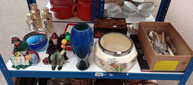 2 royal doulton figures hn2017 - silk & ribbon & hn1954 - the balloon man together with caithness 'salome' art glass vase & other over 1 shelf
