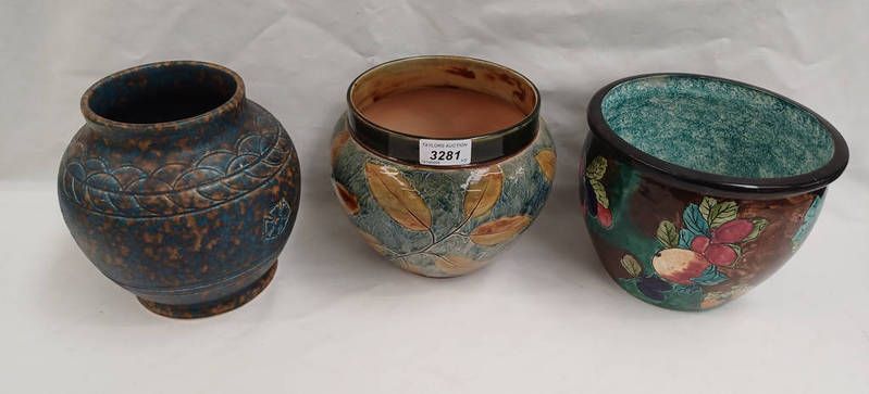 Royal doulton jardiniere with leaf decoration (height - 16.5cm) together with ruskin and 1 other