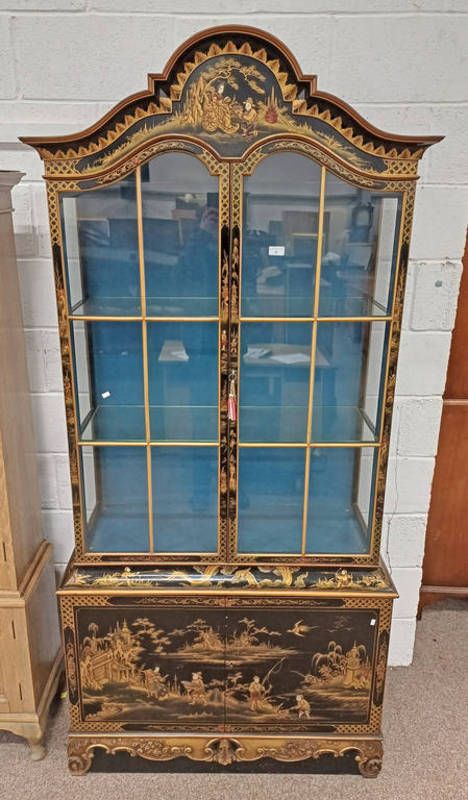 Black & gilt chinoiserie display cabinet with 2 glazed doors over 2 panel doors with overall oriental scene decoration - 214cm tall
